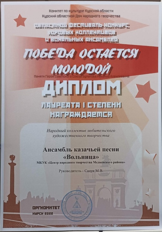 Поздравляем народный ансамбль казачьей песни "ВОЛЬНИЦА" с Победой в областном фестивале - конкурсе хоровых коллективов и вокальных ансамблей "Победа остается молодой"!!!