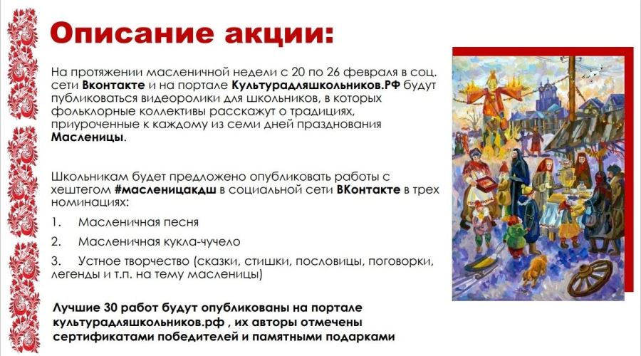 С 20 по 26 февраля 2023 года состоится Всероссийская акция "Широкая Масленица", направленная на популяризацию традиционной культуры народов России.