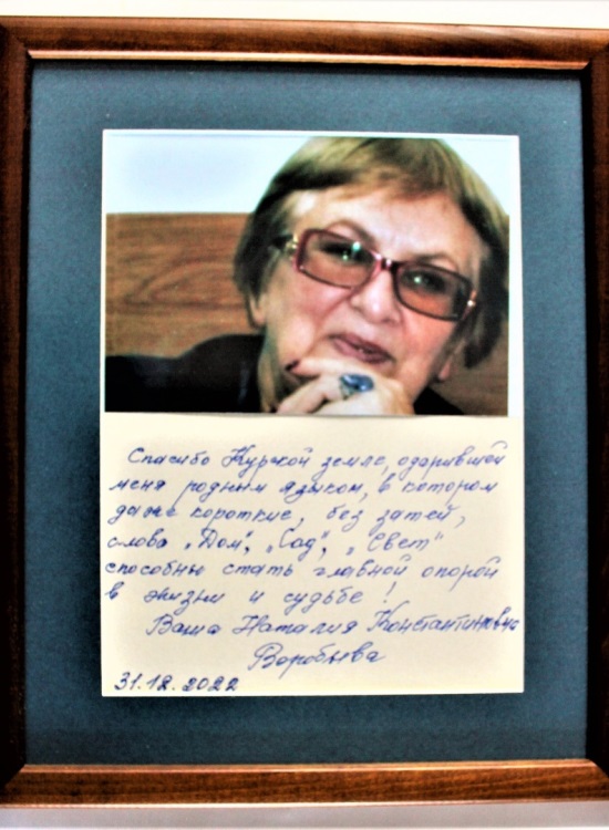 Музей обратился к дочери большого русского писателя Константина Дмитриевича Воробьёва Наталии Константиновне, проживающей в Москве, с просьбой подарить свой портрет с автографом. Вот что написала талантливая дочь талантливого отца: «Спасибо Курской земле, одарившей меня родным языком, в котором даже короткие, без затей, слова «Дом», «Сад», «Свет» способны стать главной опорой в жизни и судьбе!» Портрет займёт своё место в «хранилище памяти», и мудрость этого откровения осветит каждого, кто придёт в гости к Воробьёву.
