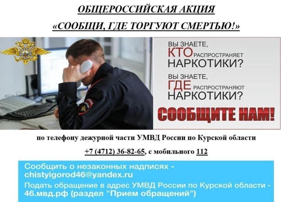 С 13 по 24 марта 2023 года на территории Курской области проходит первый этап Общероссийской акции «Сообщи, где торгуют смертью!».