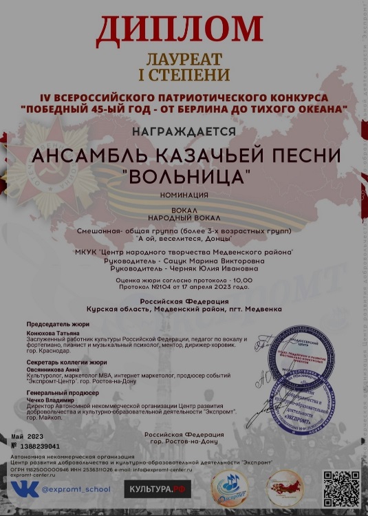 Согласно результатам IV Всероссийского патриотического конкурса "Победный 45-ый - от Берлина до Тихого океана" ансамбль казачьей песни "Вольница" получил заслуженный Диплом Лауреата I степени!