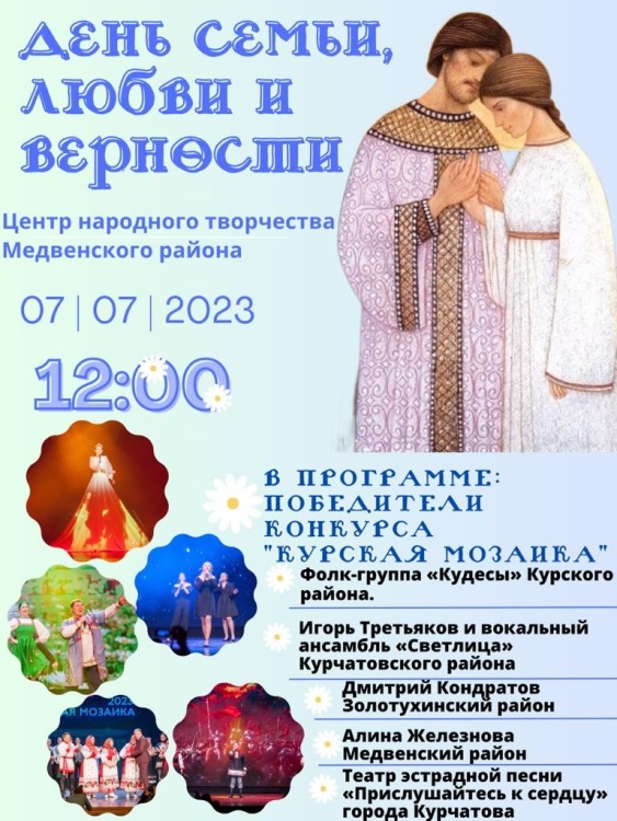 Приглашаем 7 июля 2023 года в Центр народного творчества жителей и гостей Медвенского района на праздничное мероприятие, посвященное Дню семьи, любви и верности!