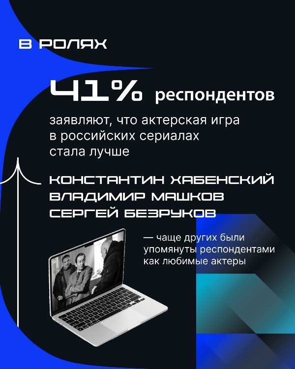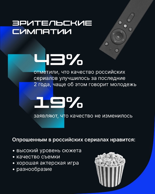 В исследовании участвовали 4000 россиян, большинство из них выделило высокий уровень сюжета и актерской игры, качество съемки, а также разнообразие сериалов.