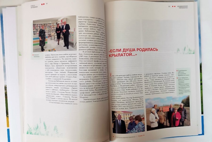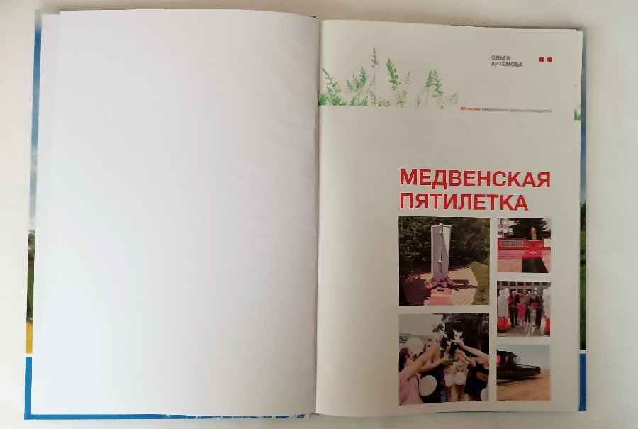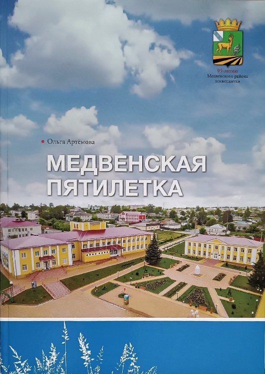 В 2023 году Медвенский район отпраздновал славный юбилей – 95-летие. Необыкновенным подарком к этому замечательному празднику стала книга члена Союза писателей России Ольги Артёмовой – «Медвенская пятилетка». Она написана по заказу Администрации Медвенского района и является неотъемлемой частью краеведческой юбилейной дилогии.
