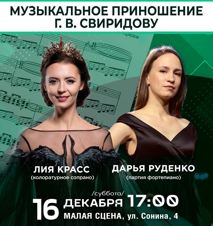 16 декабря на Малой сцене «Свиридовского» пройдет концерт «Музыкальное приношение Георгию Свиридову». В нем примут участие артисты филармонии Лия Красс и Дарья Руденко. В программу войдут сочинения Георгия Свиридова, Сергея Рахманинова, Александра Алябьева и других композиторов.