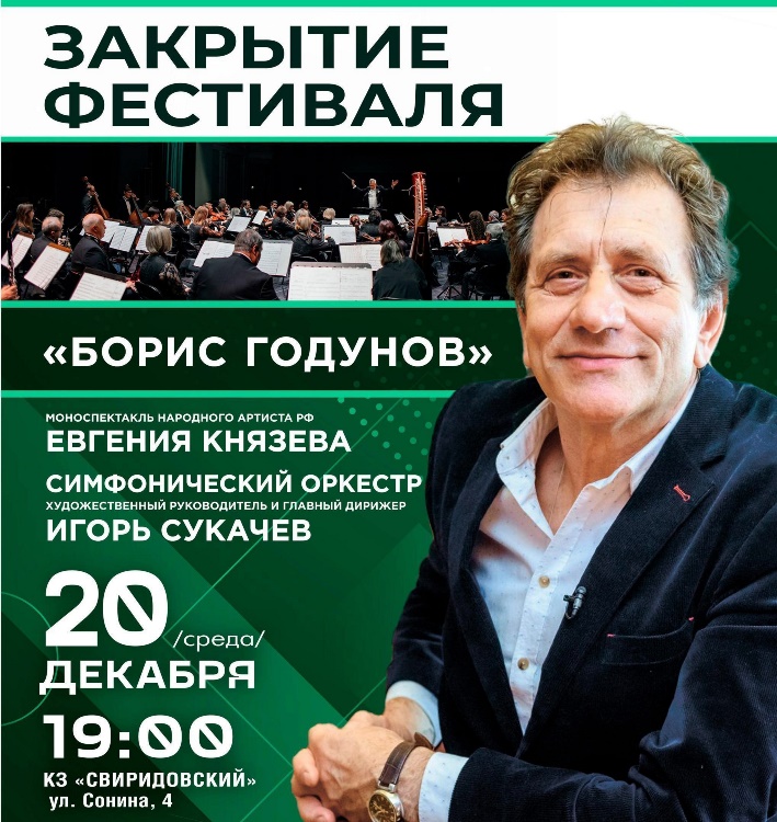 Закрытие фестиваля состоится на Большой сцене концертного зала 20 декабря. Зрители увидят моноспектакль по драме Александра Пушкина «Борис Годунов» в исполнении народного артиста РФ Евгения Князева. Концерты доступны по Пушкинской карте. Билеты – в кассах филармонии.