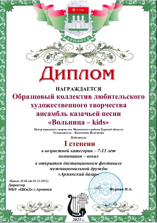 Поздравляем ПОБЕДИТЕЛЕЙ - Образцовый коллектив любительского художественного творчества ансамбль казачьей песни "Вольница -kids" (руководитель Железнова Валентина Николаевна).