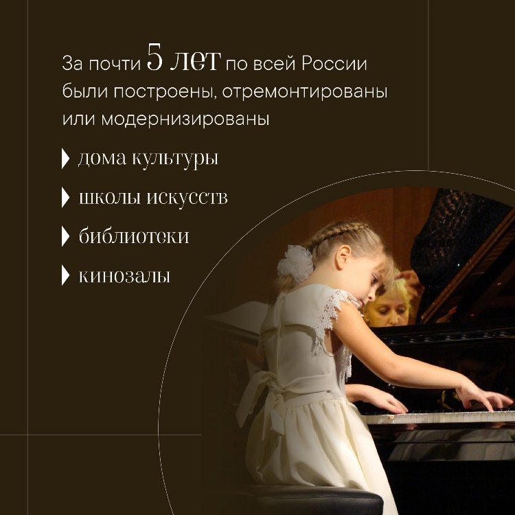 Ведь в рамках нацпроекта за последний год построили, реконструировали или капитально отремонтировали 274 детские школы искусств и 336 сельских домов культуры в регионах.