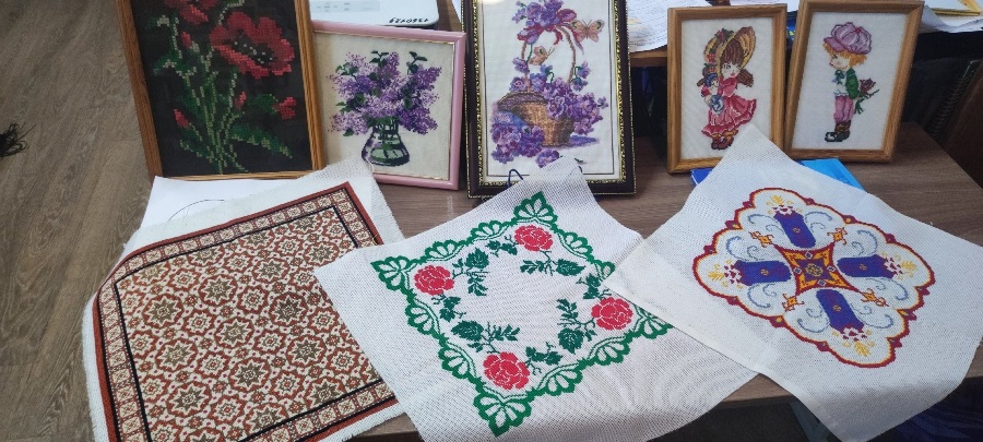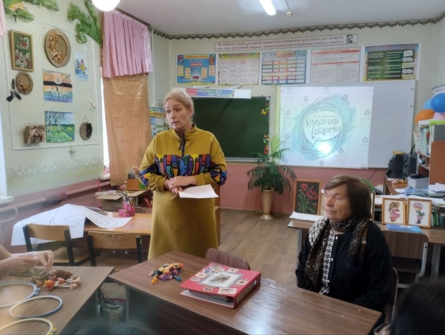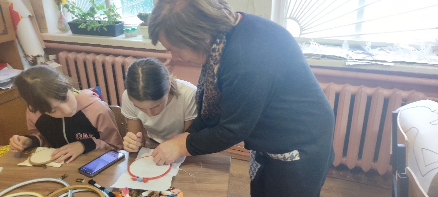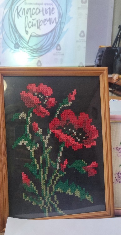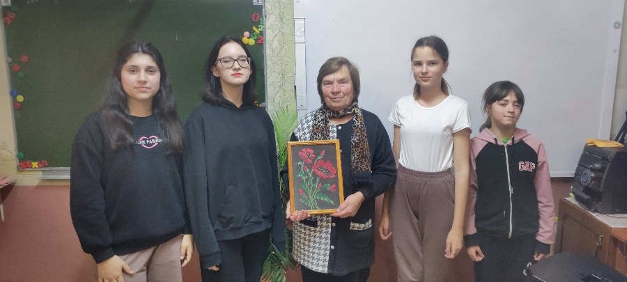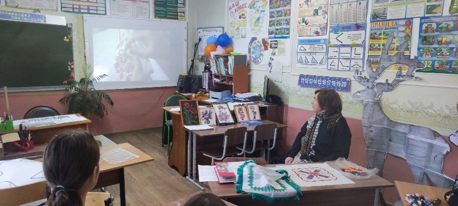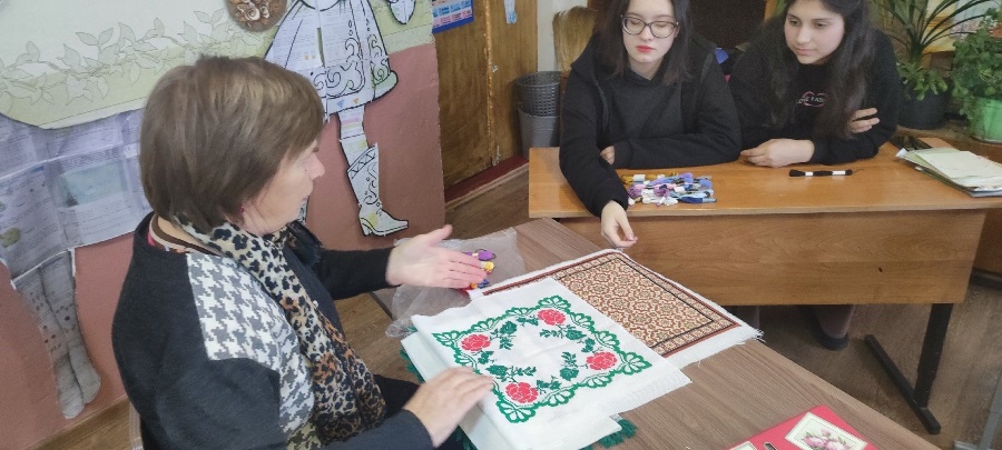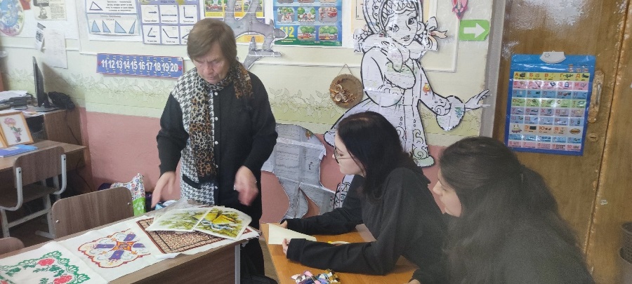 Нина Калиновна не просто провела мастер - класс для школьников, но ещё поделилась своими воспоминаниями из детства.Она хорошо запомнила, как ее бабушка ткала на ткацком станке, а сестра научила вышивке крестом.