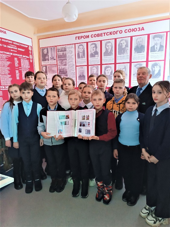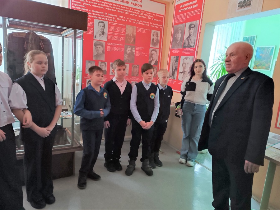 Не стал исключением и 2024 год. В музее проходят встречи с прошлым. Первыми на них пришли ученики Медвенской СОШ. Перед ребятами выступил председатель районного Совета ветеранов Н.Н. Тельных. О своей встрече с В.С. Брэмом, воины которого первыми вошли в Медвенку 9 февраля 1943 года, рассказал Н.В. Переверзев.