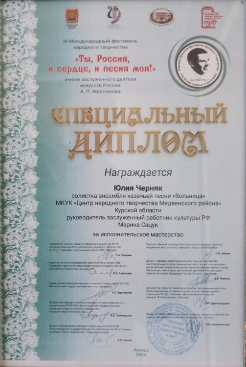 Из более 700 участников грандиозного праздника народного творчества ЮЛИЯ ИВАНОВНА награждена специальным Дипломом за лучший вокал и исполнительское мастерство III Международного фестиваля народного творчества имени заслуженного деятеля искусств России А. П. Мистюкова «Ты, Россия, и сердце, и песня моя!».