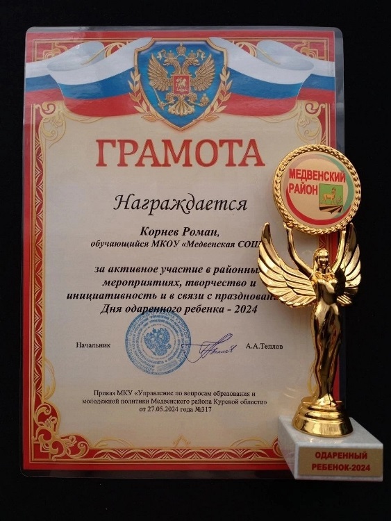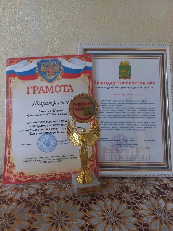 Почётной грамотой наградили солистов ансамбля казачьей песни "Вольница kids" Корнева Романа и Сивцеву Марию за активное участие в районных мероприятиях. Сивцева Мария также была награждена благодарственным письмом Главы Медвенского района Виктора Владимировича Катунина.