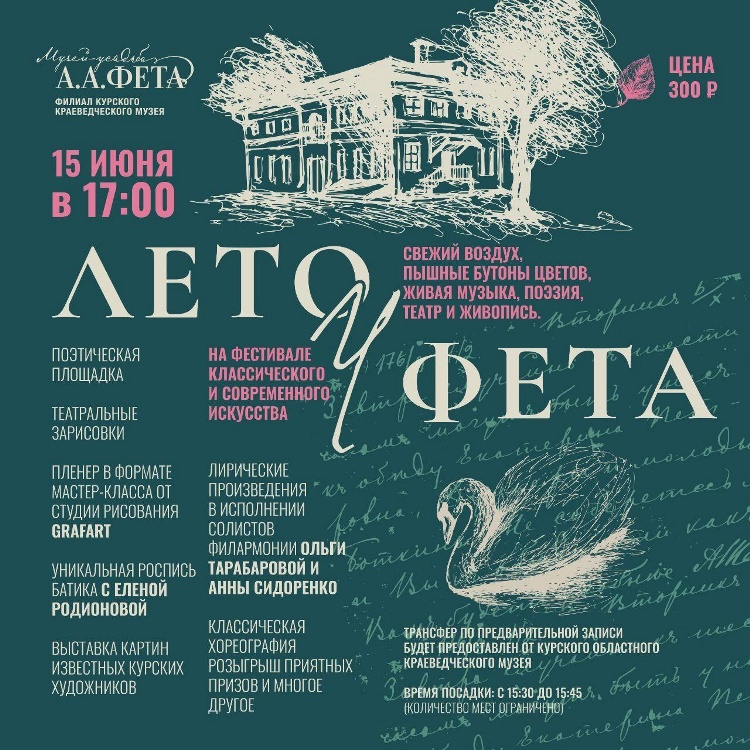 В музее «Усадьба А.А. Фета» в Золотухинском районе 15 июня состоится фестиваль классического и современного искусства «Лето у Фета». Будут работать поэтическая площадка, выставка картин известных курских художников. Солисты Курской государственной филармонии Ольга Тарабарова и Анна Сидоренко исполнят лирические произведения.