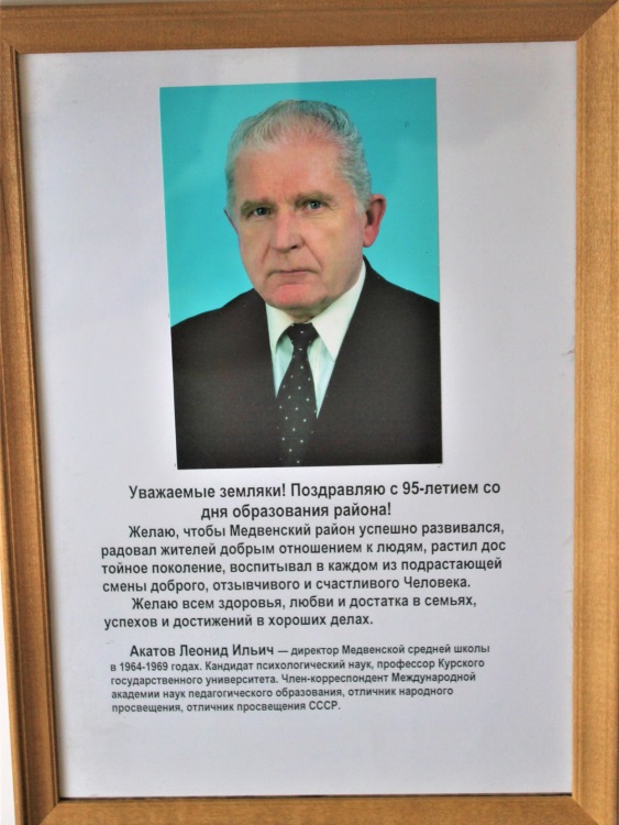 В прошлом году Медвенский район отметил юбилей. 13 июня мы празднуем 90-летие Курской области. К знаменательным датам музей имени Д.Я. Самоквасова приурочил акцию «Твоя строка в биографии малой родины». «Хранилищу памяти» подарили свои портреты со словами напутствия патриоты: профессор, писатель-краевед Л.И. Акатов, поисковики И.Л. Иванов и Е.Н. Бутенко, возглавлявшая районный архив Н.В. Манухина.