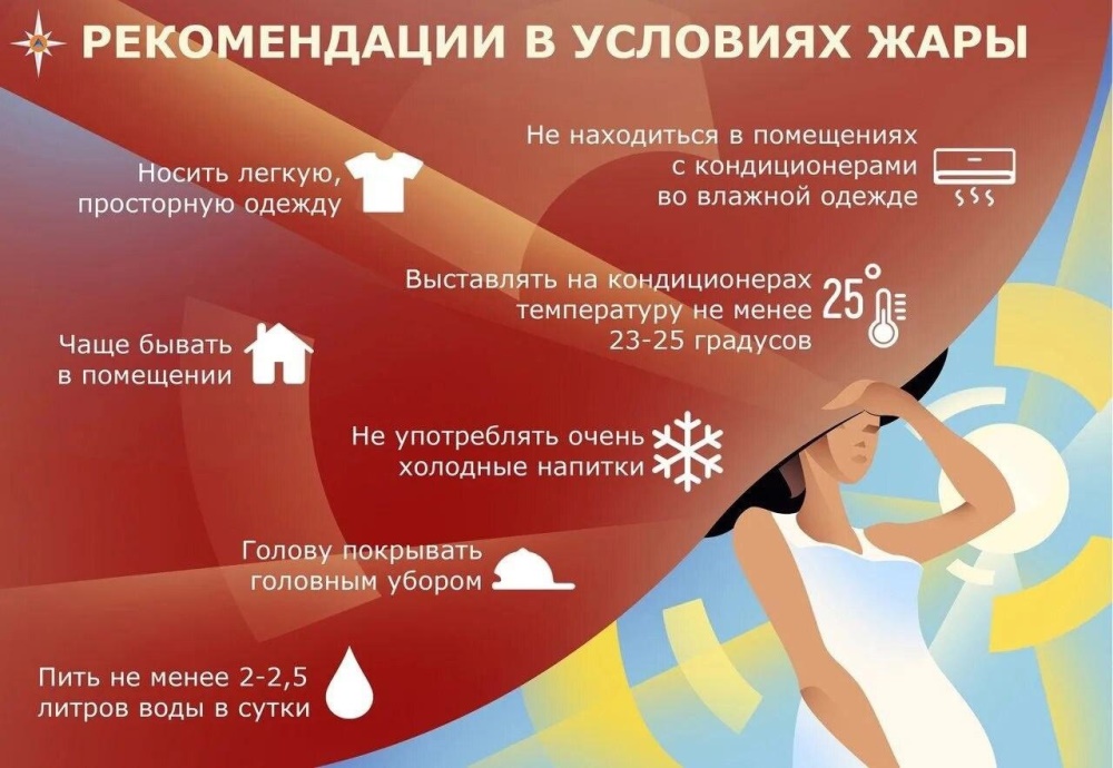 Жителям советуют держаться в тени, побольше пить (НЕ алкоголь, в идеале - воду), не переедать, носить головной убор и одежду из натуральных тканей. Более подробно - в памятке (сохранить о отправить близким).