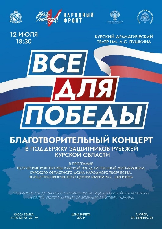 В пятницу, 12 июля, в 18:30 на сцене Курского драматического театра состоится первый благотворительный концерт «Все для Победы!» в поддержку наших бойцов. Творческую программу зрителям представят коллективы Курской государственной филармонии, областного Дома народного творчества, концертно-творческого центра им. М.С. Щепкина.