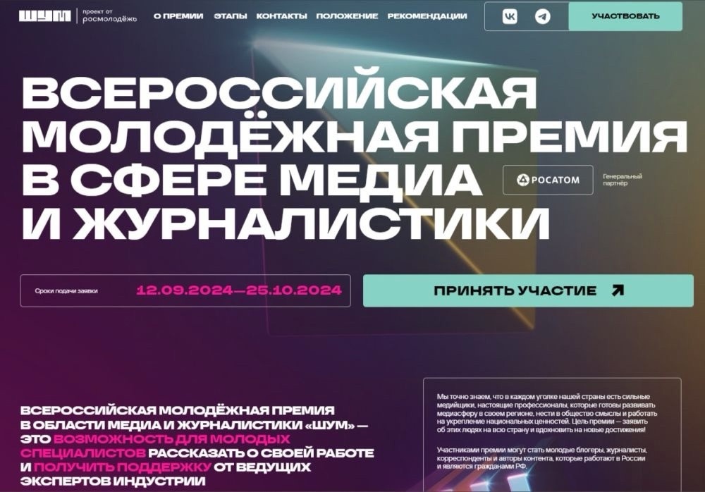 В период с 12 сентября по 6 декабря 2024 года проводится Всероссийская молодежная премия в сфере медиа и журналистики «ШУМ». Организаторами выступают Федеральное агентство по делам молодежи и Правительство Калининградской области, генеральный партнер - Госкорпорация «Росатом».