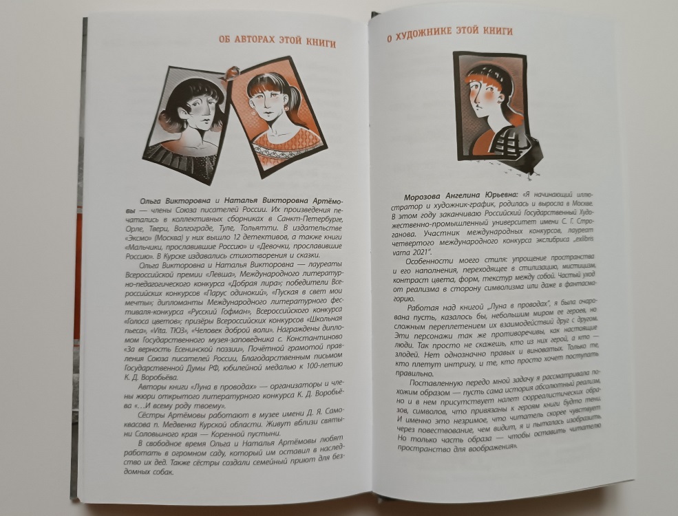 Ангелина Юрьевна Морозова, иллюстратор, художник-график: «Работая над книгой "Луна в проводах", я была очарована пусть, казалось бы, небольшим миром ее героев, но сложным переплетением их взаимодействий друг с другом. Эти персонажи так же противоречивы, как настоящие люди. Так просто не скажешь, кто из них герой, а кто — злодей. Нет однозначно правых и виноватых. Только те, кто плетут интригу, и те, кто просто хочет поступать правильно. Поставленную передо мной задачу я рассматривала похожим образом — пусть сама история абсолютный реализм, но и в нем присутствует налет сюрреалистических образов, символов, что привязаны к героям книги будто тени».