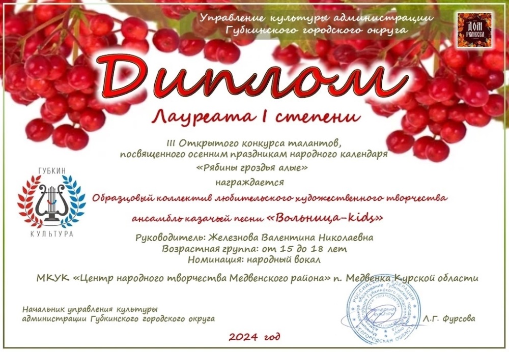 Поздравляем с победой в III Открытом конкурсе талантов «Рябины гроздья алые».
