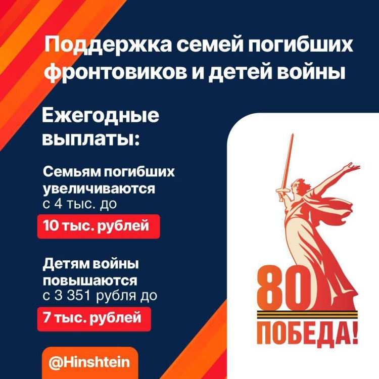 - Ежегодные выплаты семьям погибших фронтовиков вырастут с 4 до 10 тыс. рублей.