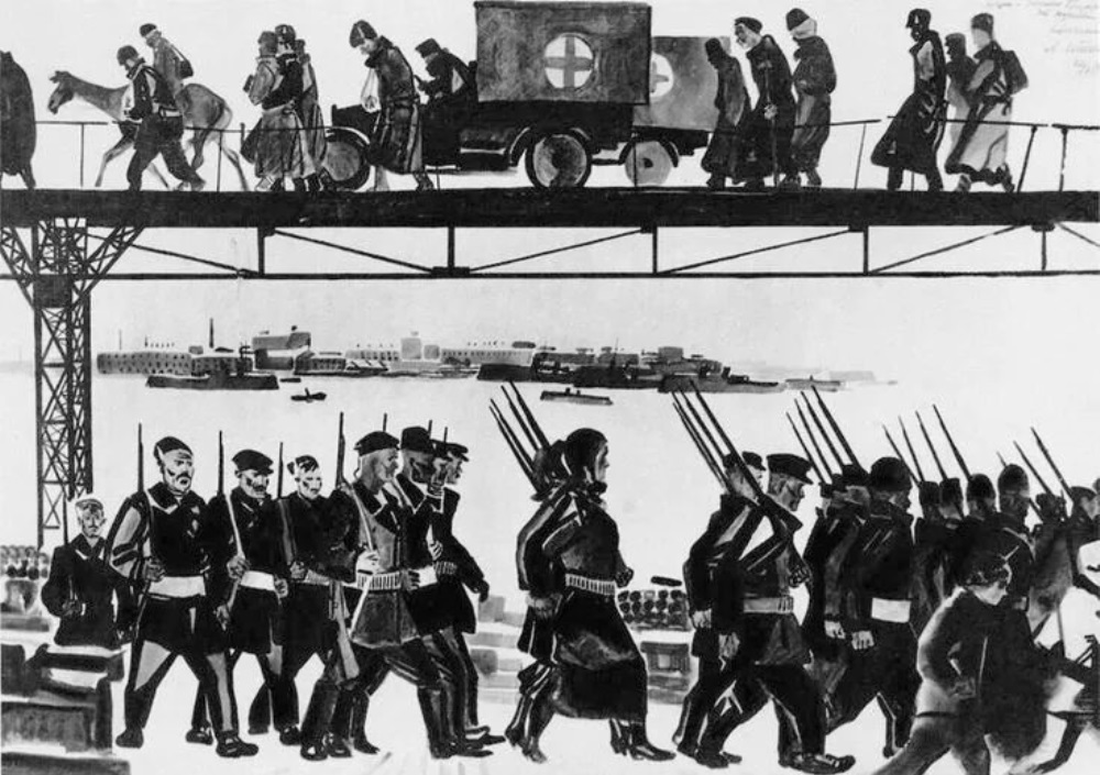 Или наш курский художник Александр Дейнека и его "Оборона Петрограда", посвящённая событиям Гражданской войны. В годы Великой Отечественной войны на первый план в творчестве Дейнеки вышли военные сюжеты "Оборона Севастополя", "Окраина Москвы" ...