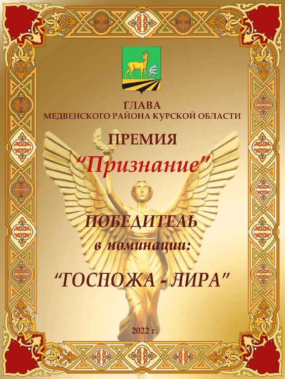 В номинации «Госпожа Лира» победителем премии Главы Медвенского района "Признание" признана Долженкова Татьяна Александровна, заведующая Коммунарским сельским Домом культуры.