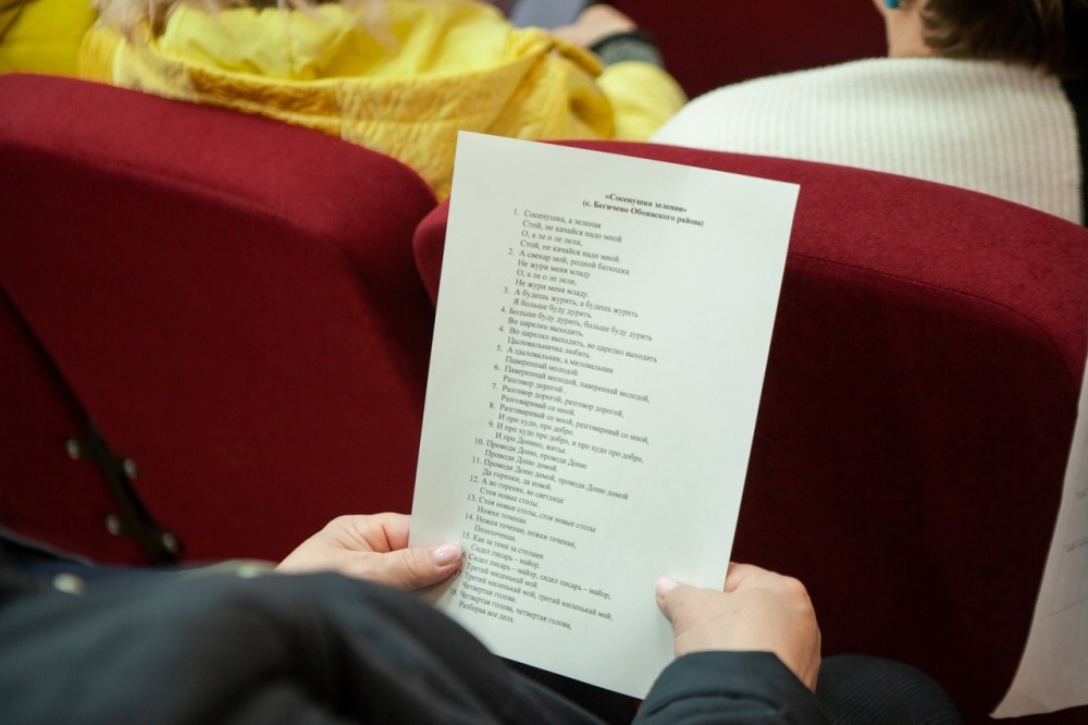 С курским фольклором, традиционными музыкальными инструментами, танками и карагодами, головными уборами участников познакомила руководитель фольклорного ансамбля «Ларец» Анна Кунавина. Теорию закрепили на практике: участники разучили песню с. Бегичево Обоянского района «Сосенушка зеленая».
