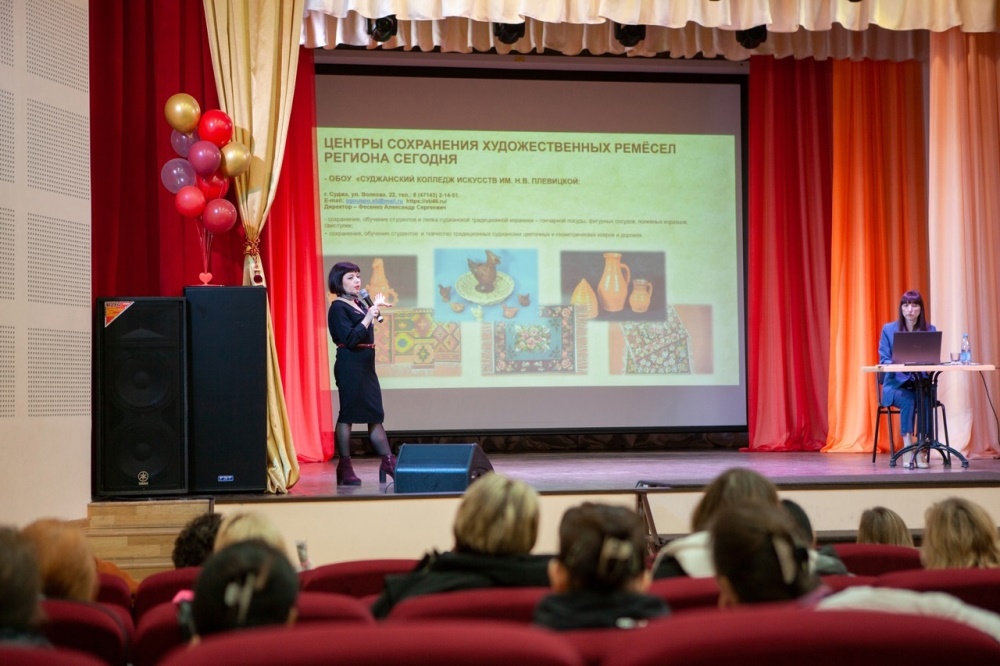 О забытых и ныне существующих курских ремеслах рассказала заведующая сектором по работе с филиалами ОДНТ Татьяна Нестеренко, а главные специалисты Елизавета Цветкова и Светлана Бугорская познакомили с экспедиционной деятельностью Дома народного творчества, принципами оформления выставочных пространств.