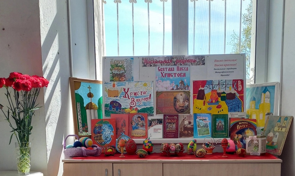 В Митрофановском храме села Панино работниками культуры организована выставка «Пасхальная радость», посвященная Светлому Празднику Пасхи.