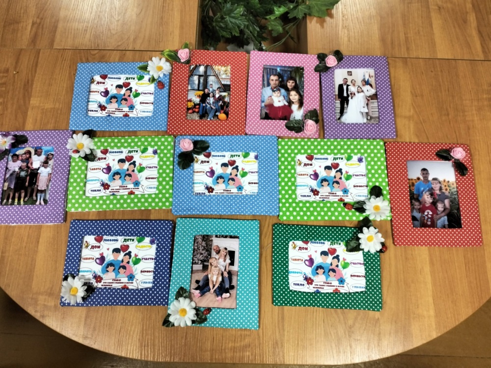 Дети своими руками изготовили красочные, яркие фоторамки и вставили в них фото своих семей. Каждый в своё работу вложил частичку любви, уважения, доброты и терпения. Разыгралась наша фантазия и при оформлении декора.