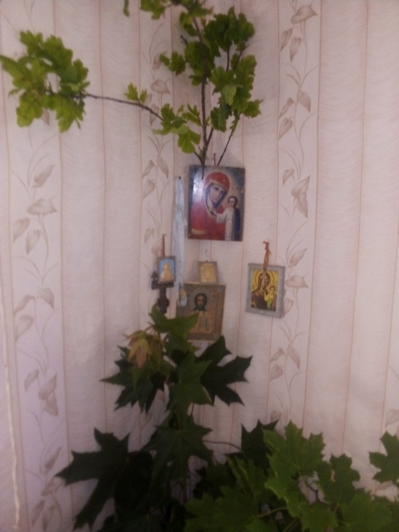 В селе Вышний Дубовец Медвенского района утром в воскресенье ломали дубовые ветки и клен, косили траву, застилали полы чабрецом, втыкали по стенкам ветки, хата вся зеленая была. Раньше берез в селе не было. Для красоты полы обмазывали желтой глиной с песком.